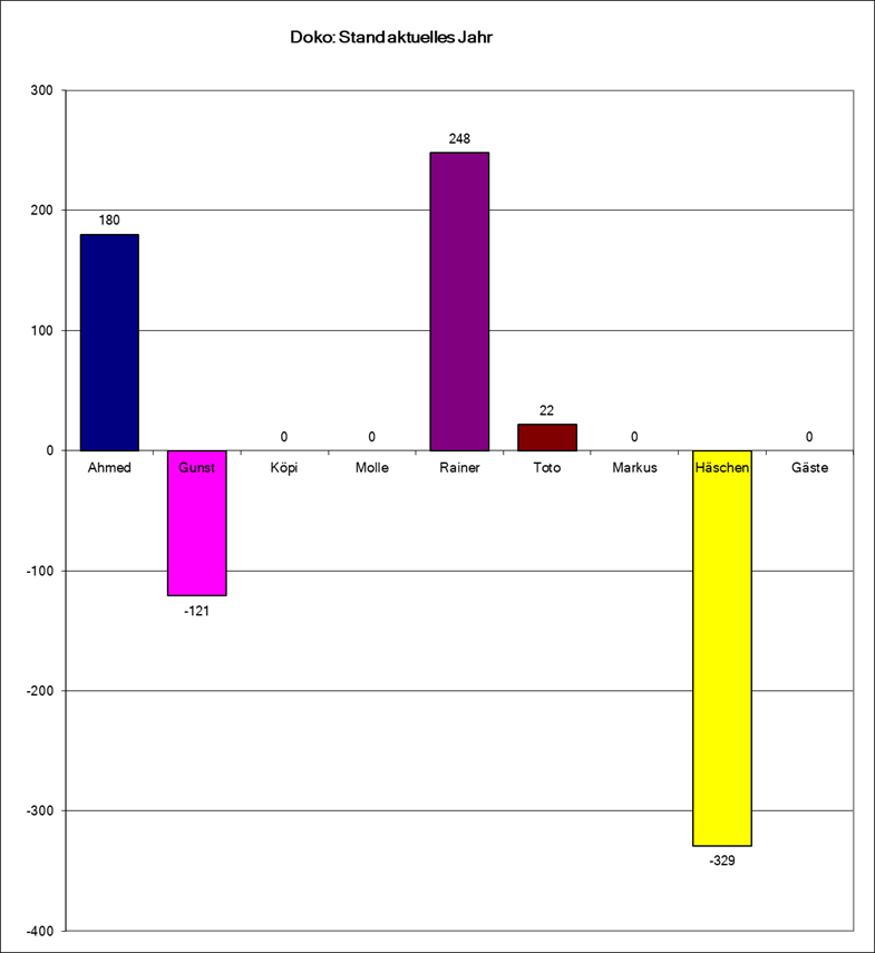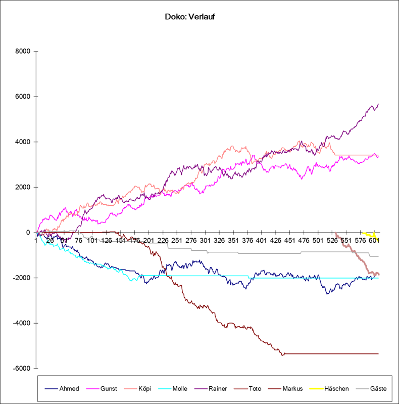 | Nr. | Datum | Ort | Ahmed | Gunst | Köpi | Molle | Rainer | Toto | Markus | Häschen | Gäste | ||||||||||